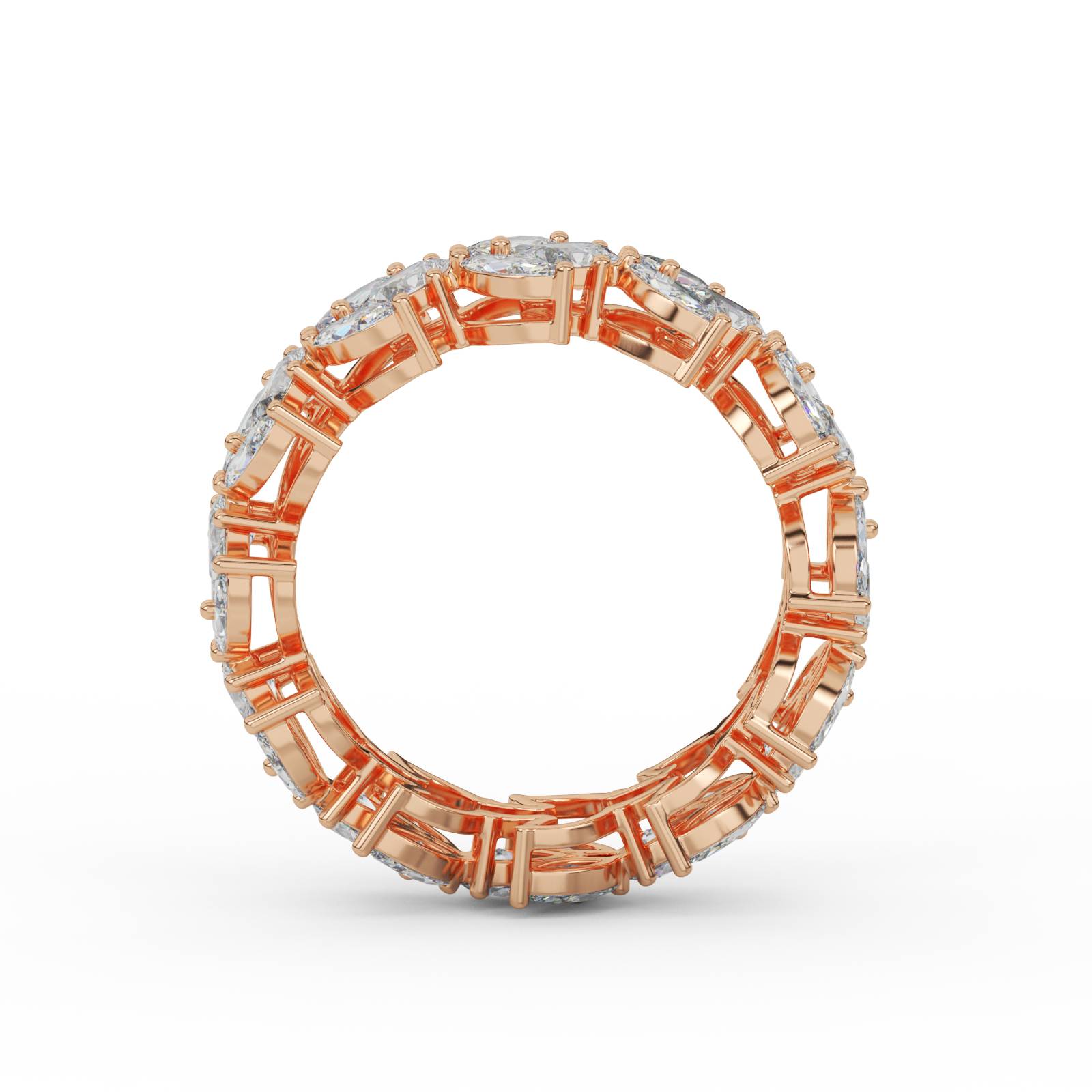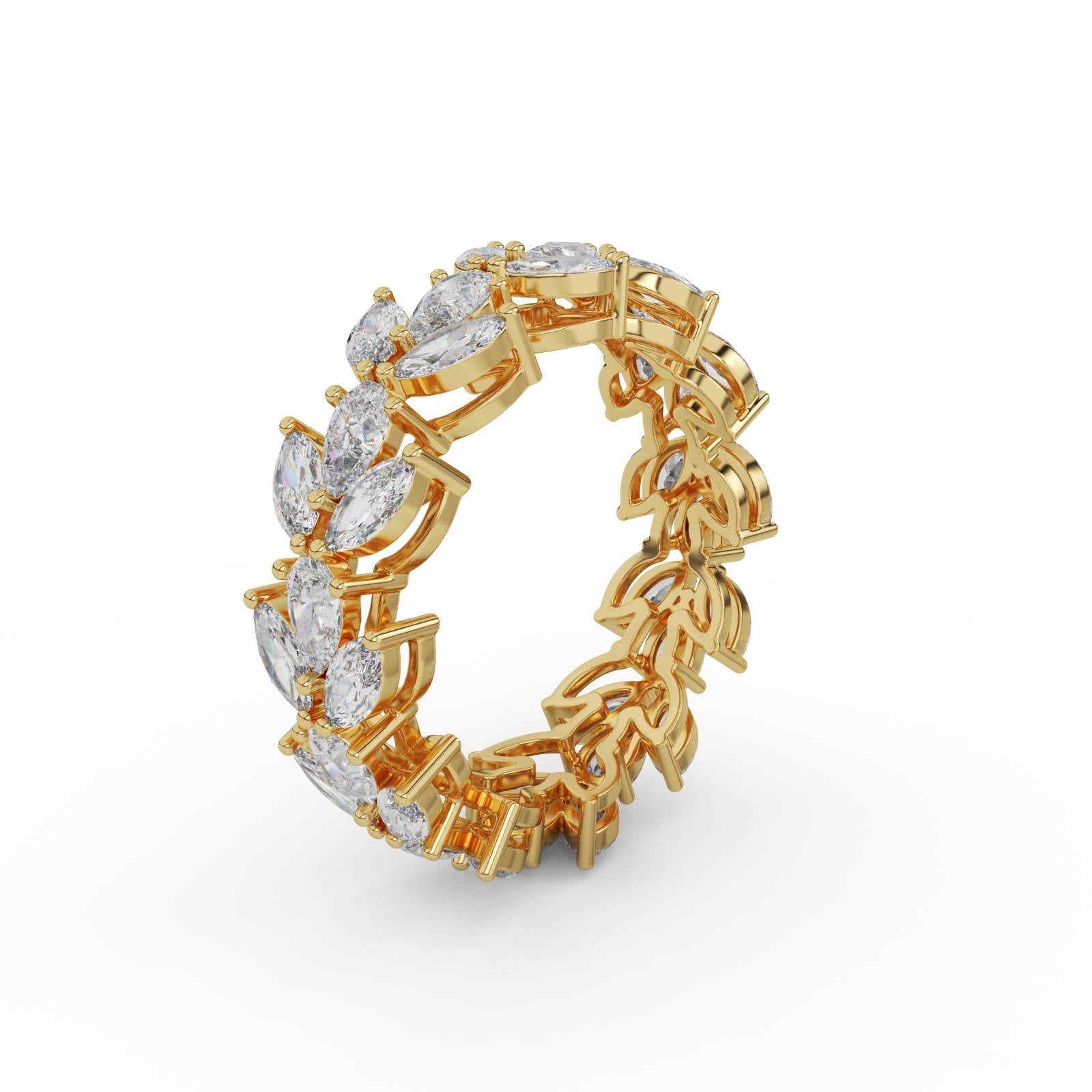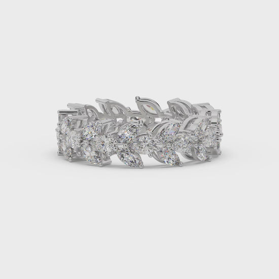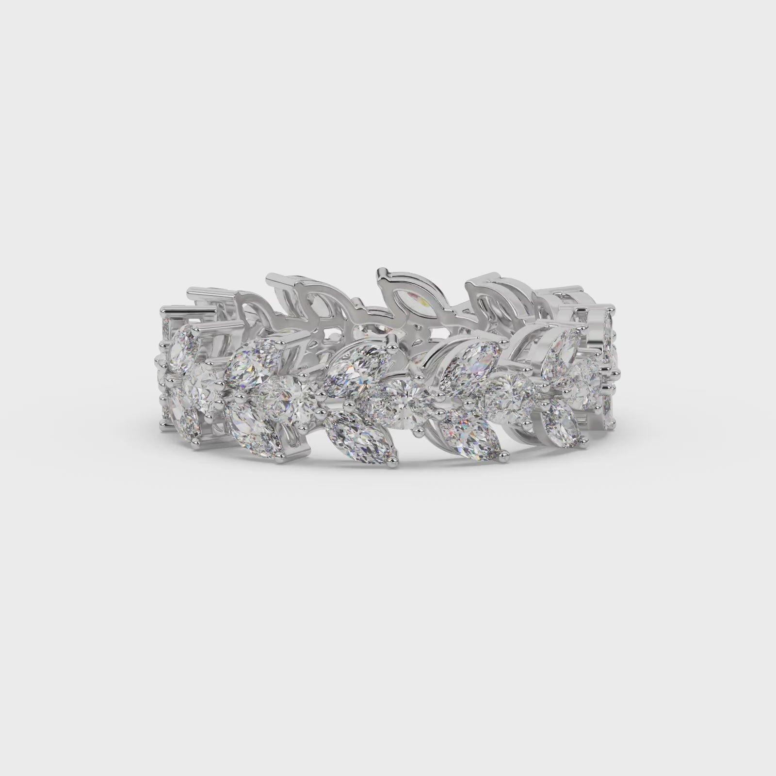 The Cascade Band arranges marquise-cut stones in a seamless, uninterrupted line — creating a flowing silhouette that shifts subtly with movement. Each stone sits slightly angled, forming a gentle sweep around the finger. The result is sculptural, luminous, and quietly expressive.