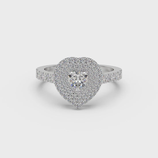 - Heart-shaped center stone with double pavé halo