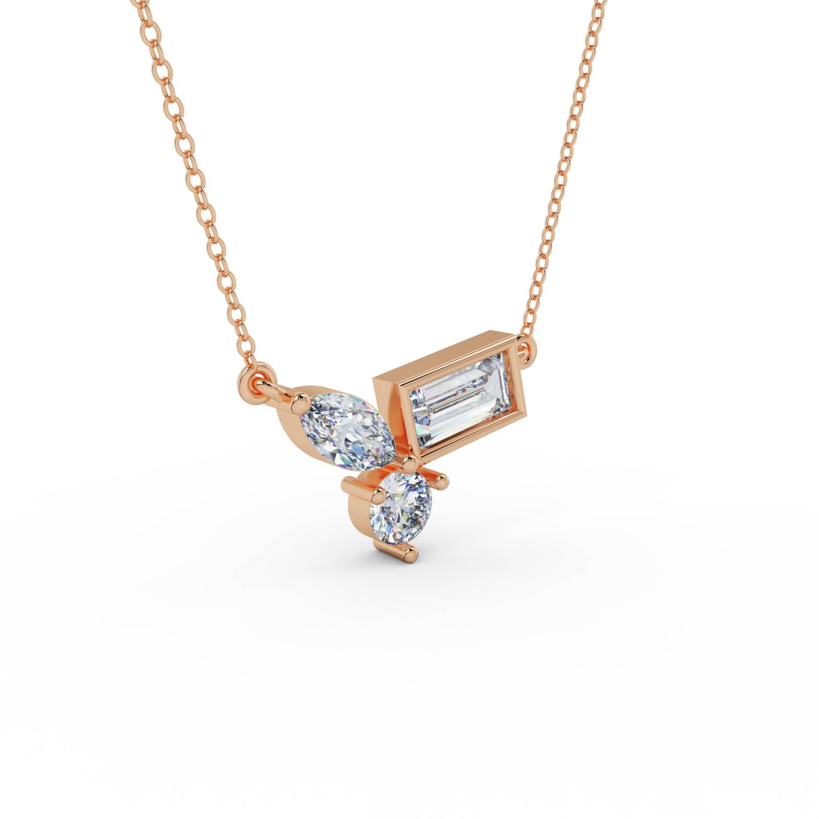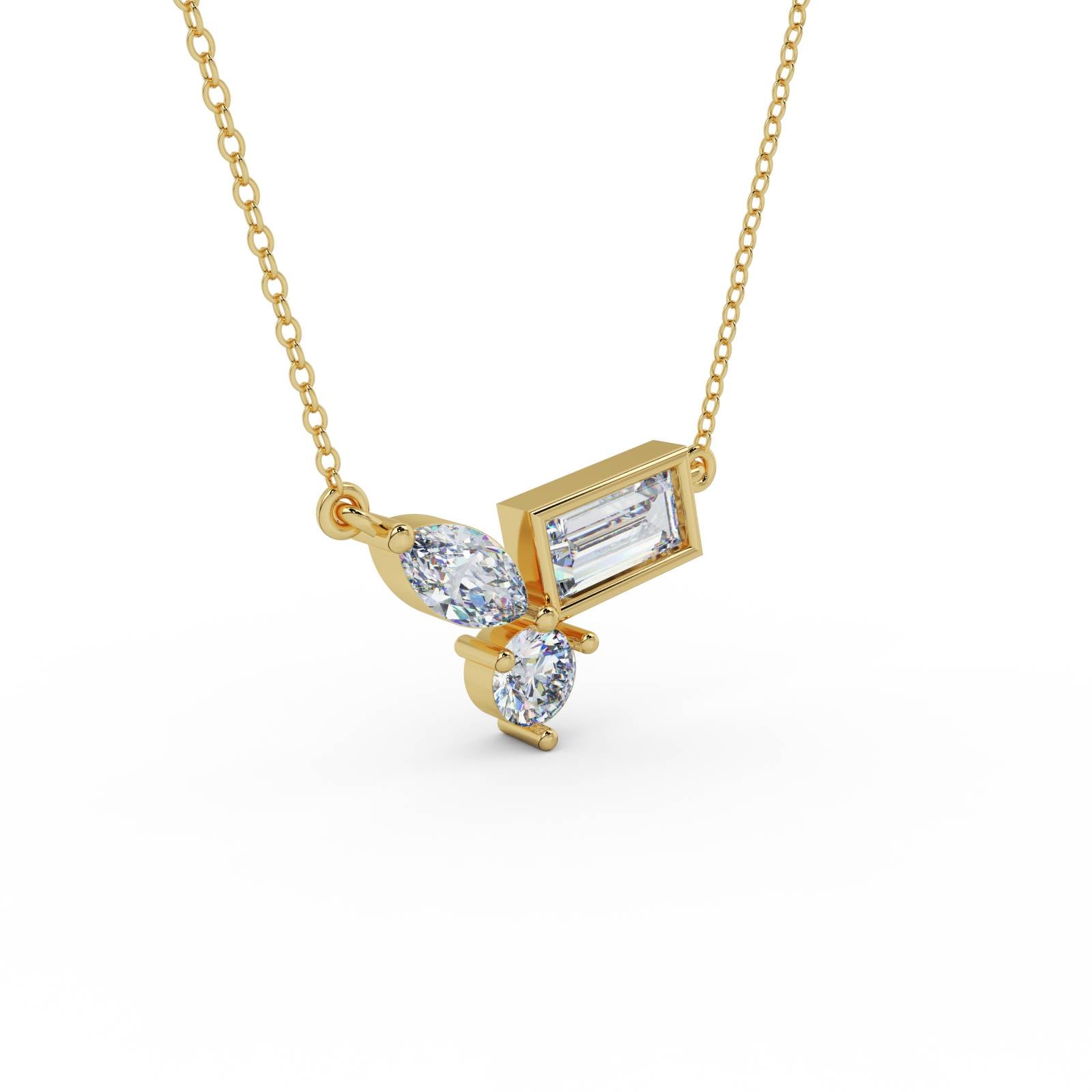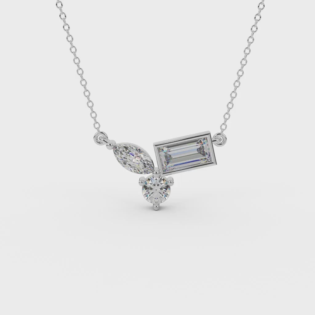The Triad Necklace pairs marquise, pear, and baguette-cut stones into a compact cluster that feels modern, refined, and quietly expressive. No symmetry, no excess — just intentional placement and clean clarity.